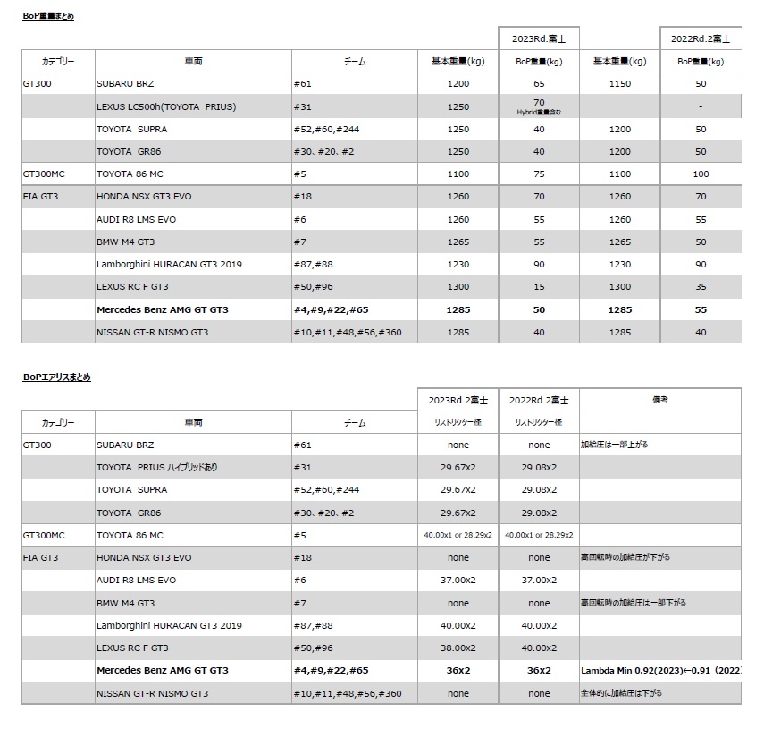 Mercedes-AMG GT3は2022年とエアリストリクター径は変わらないものの、BoP重量は昨年より5kg軽くなる。 またLamda minは0.91から0.92となり、燃費はすこし上がるが、その分パワーダウンする。