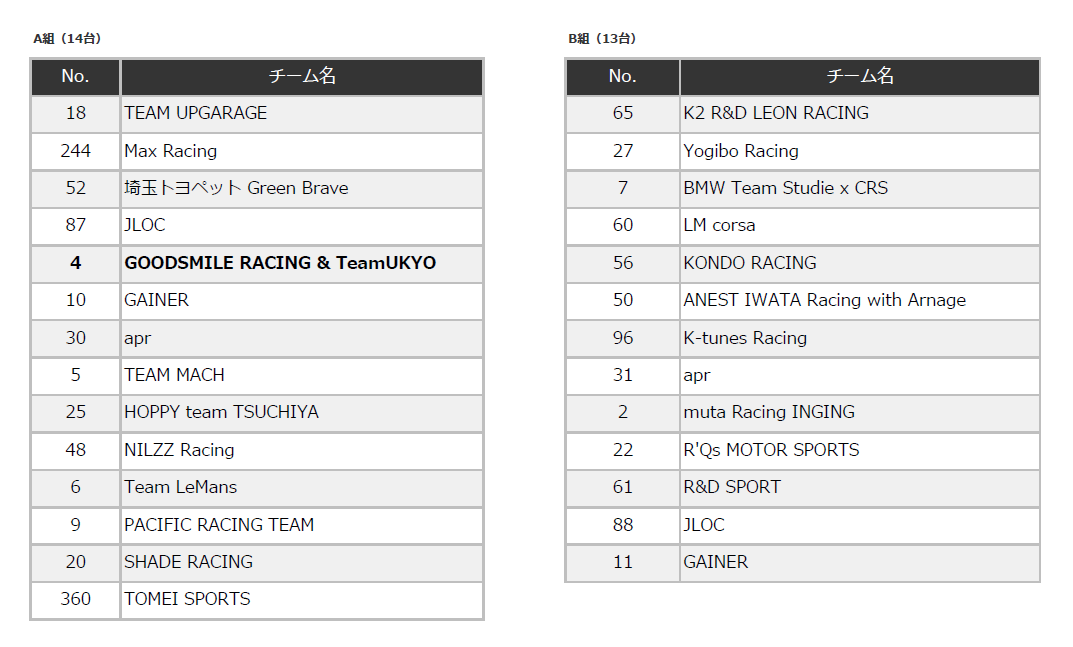 ※4月25日に9号車は前大会のクラッシュの影響で今大会出場しないことが発表された。